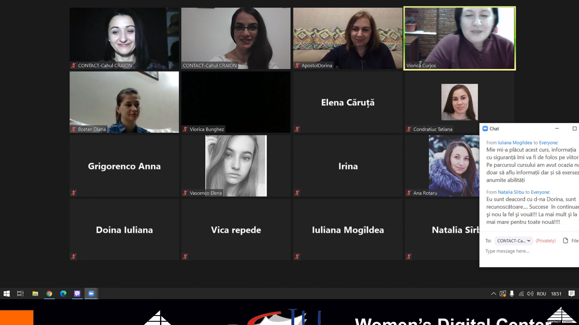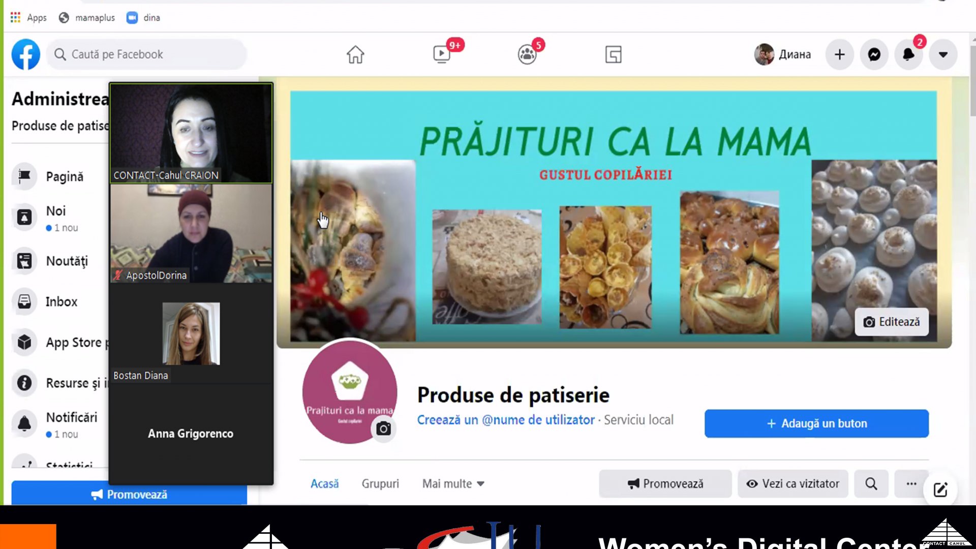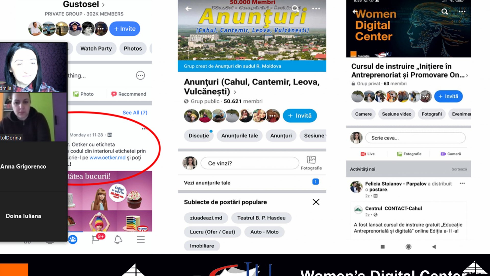 În perioada 8 – 23 februarie, 2021 echipa proiectului „Women’s Digital Center”, a realizat o serie de cursuri teoretice și practice de educare Digitală și Antreprenorială pentru beneficiarele grupului III. Au fost utilizate diverse instrumente și exemple reale pentru sporirea abilităților digitale în inițierea și dezvoltarea unei afaceri de succes în Republica Moldova.