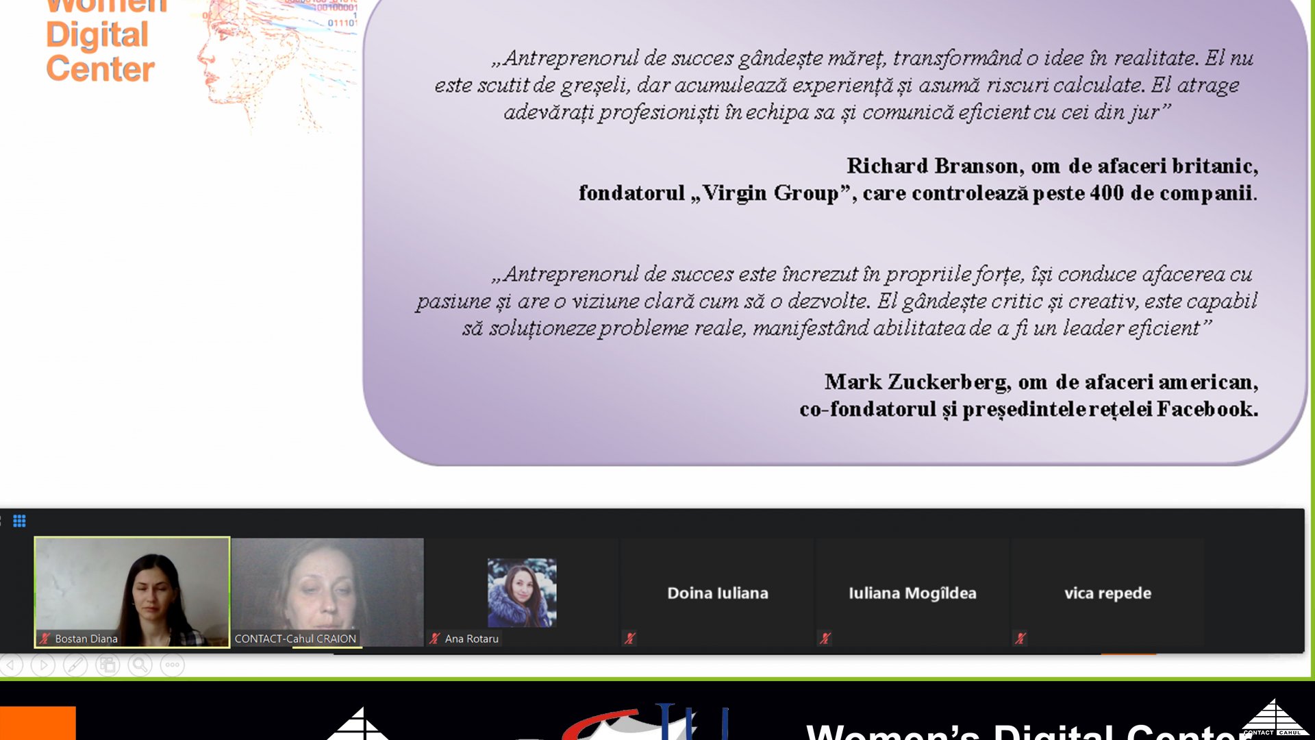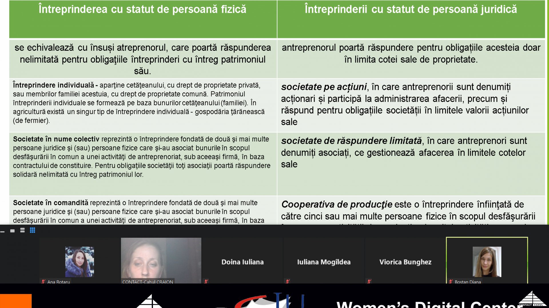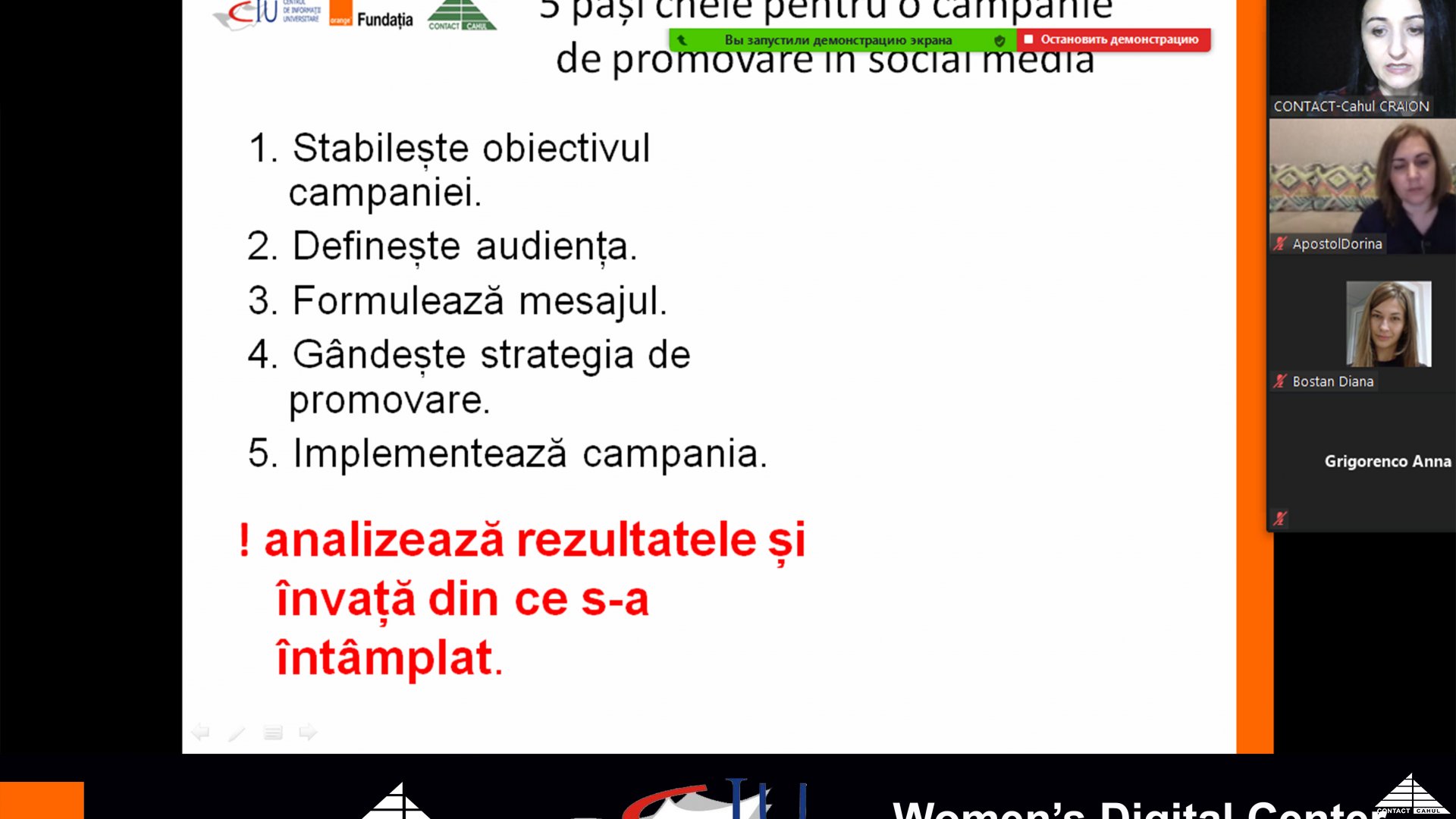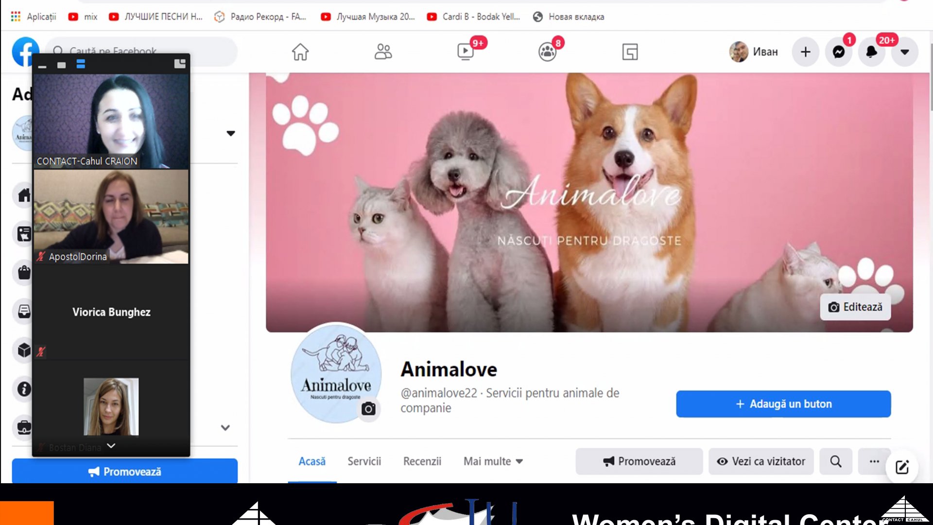 În perioada 8 – 23 februarie, 2021 echipa proiectului „Women’s Digital Center”, a realizat o serie de cursuri teoretice și practice de educare Digitală și Antreprenorială pentru beneficiarele grupului III. Au fost utilizate diverse instrumente și exemple reale pentru sporirea abilităților digitale în inițierea și dezvoltarea unei afaceri de succes în Republica Moldova.