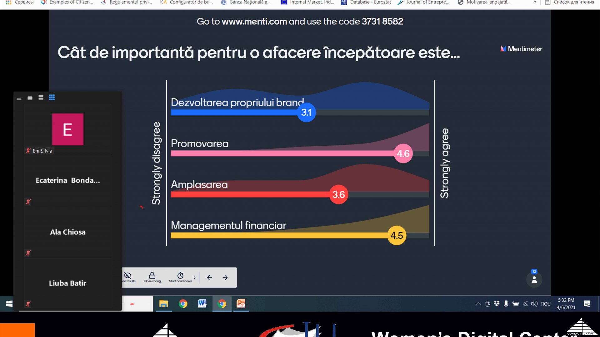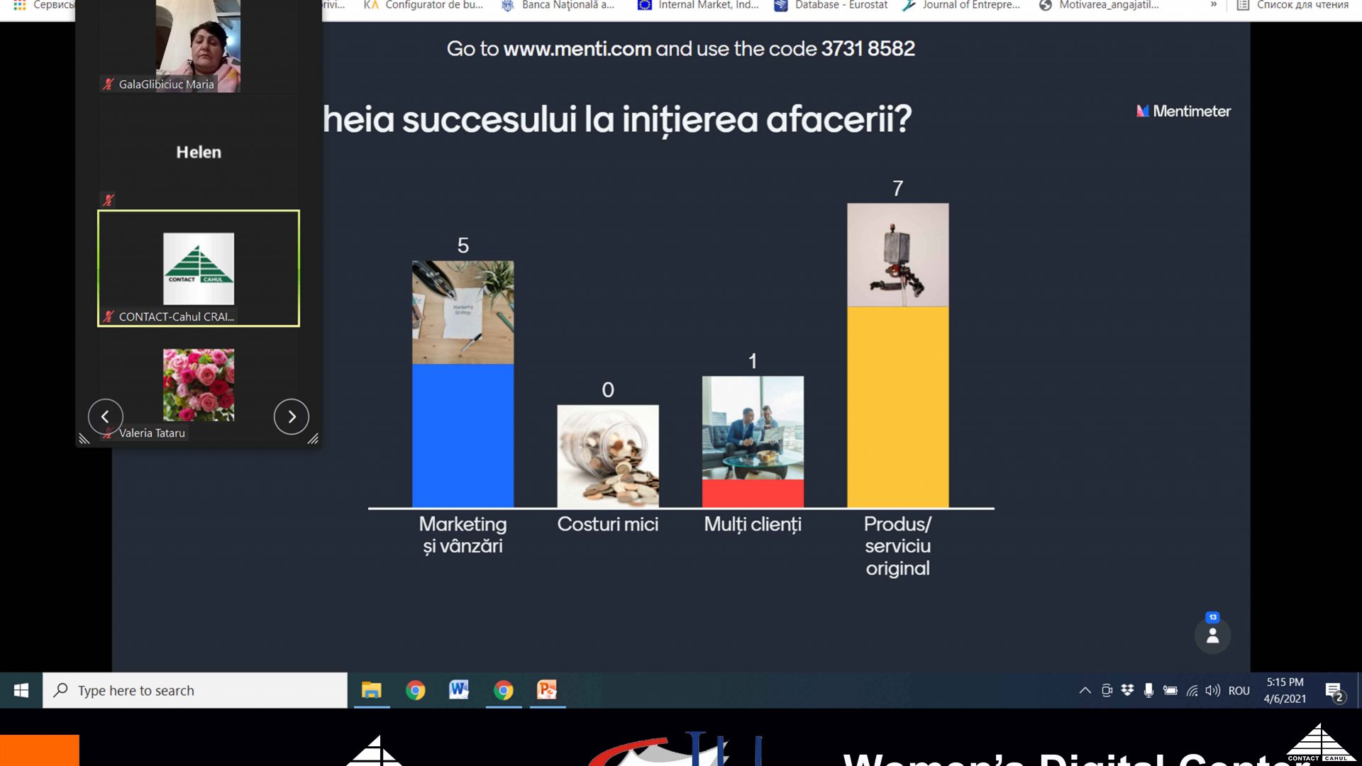 În perioada 05 - 22 aprilie, 2021 echipa proiectului „Women’s Digital Center”, a realizat o serie de cursuri teoretice și practice de educare Digitală și Antreprenorială pentru cele 17 beneficiare din grupul VII.