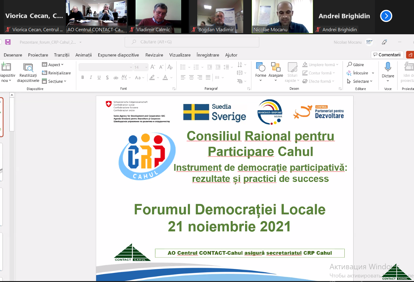 La data de 23 noiembrie curent, Consiliul Raional pentru Participare Cahul a organizat Forumul Local al Democrației Participative, ediția a III-a. Activitatea a fost una mixtă, în cadrul căreia a fost combinat mediul offline cu online.