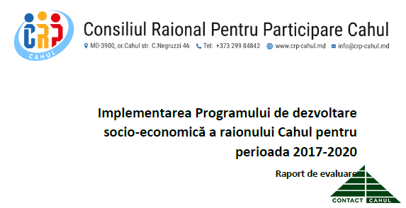 Raport de evaluare a Implementării Programului de dezvoltare socio-economică a raionului Cahul pentru perioada 2017-2020 realizat de experții naționali Tatiana Savca și Vasile Cioaric.