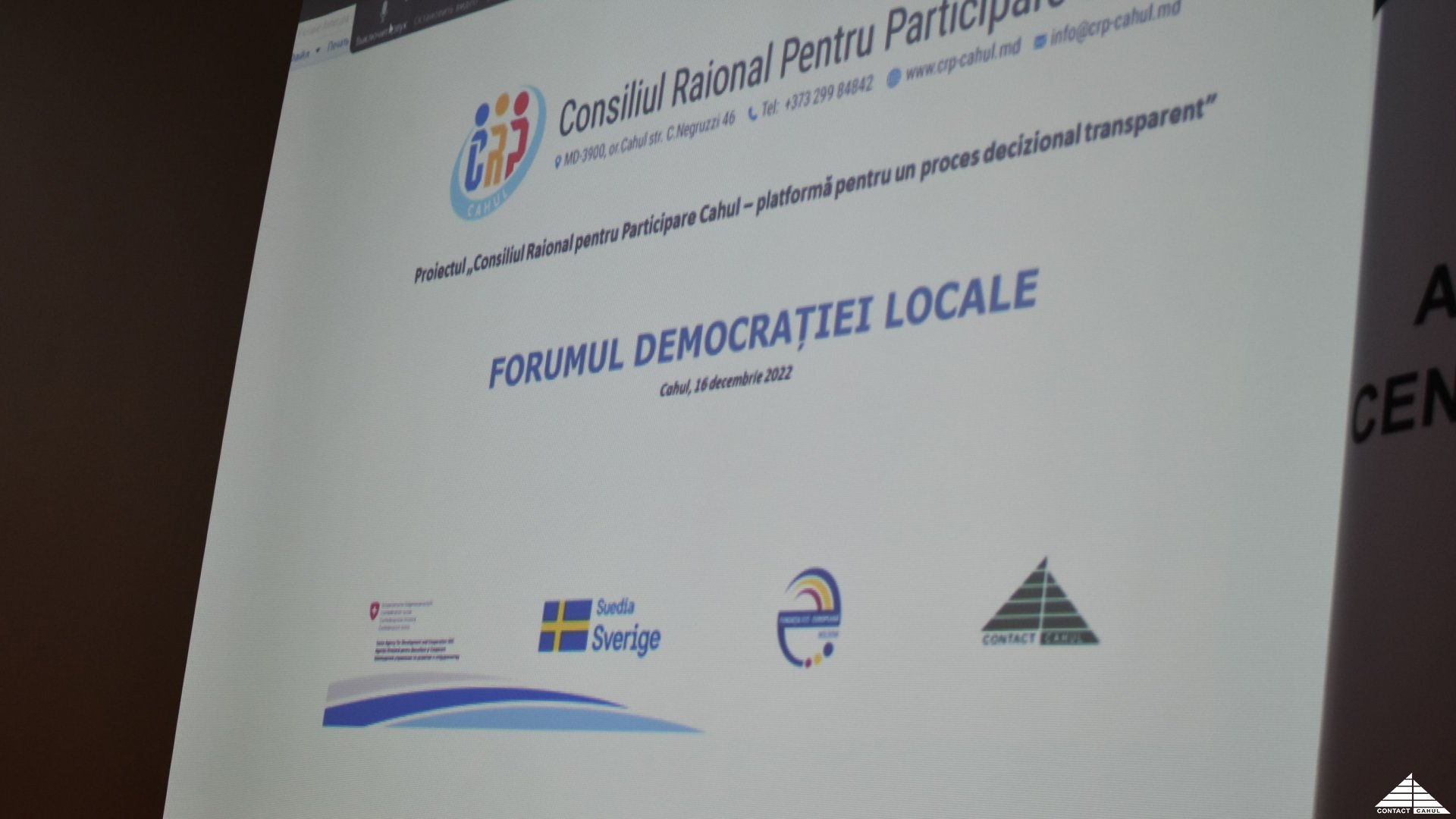 Evenimentul a fost realizat în cadrul proiectului „Consiliul Raional pentru Participare Cahul – platformă pentru un proces decizional transparent”, implementat de către Centrul CONTACT-Cahul cu suportul Fundației Est-Europene, din resursele acordate de Agenția Elvețiană pentru Dezvoltare și Cooperare (SDC) și Guvernul Suediei.